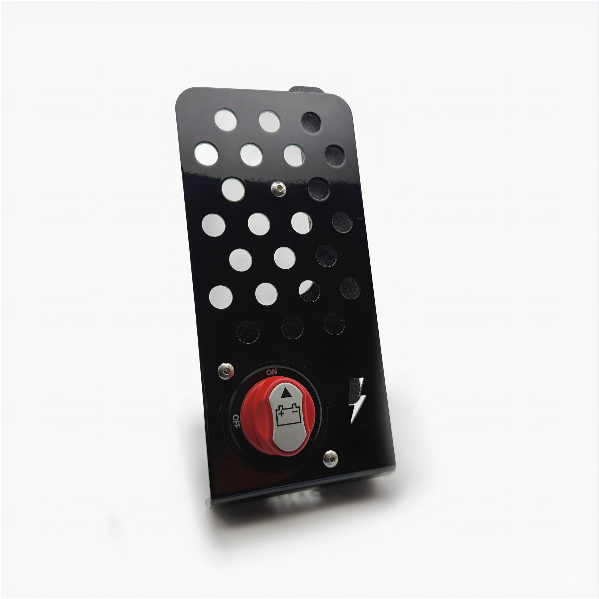 The kit consists of a replacement steel battery hold-down with integrated disconnect switch and a separate face plate that can be customized to match your car.